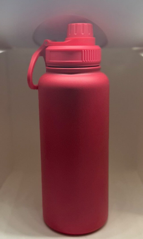 A stylish 33 oz pink stainless steel vacuum bottle, designed for superior insulation, keeping drinks hot or cold for extended hours.